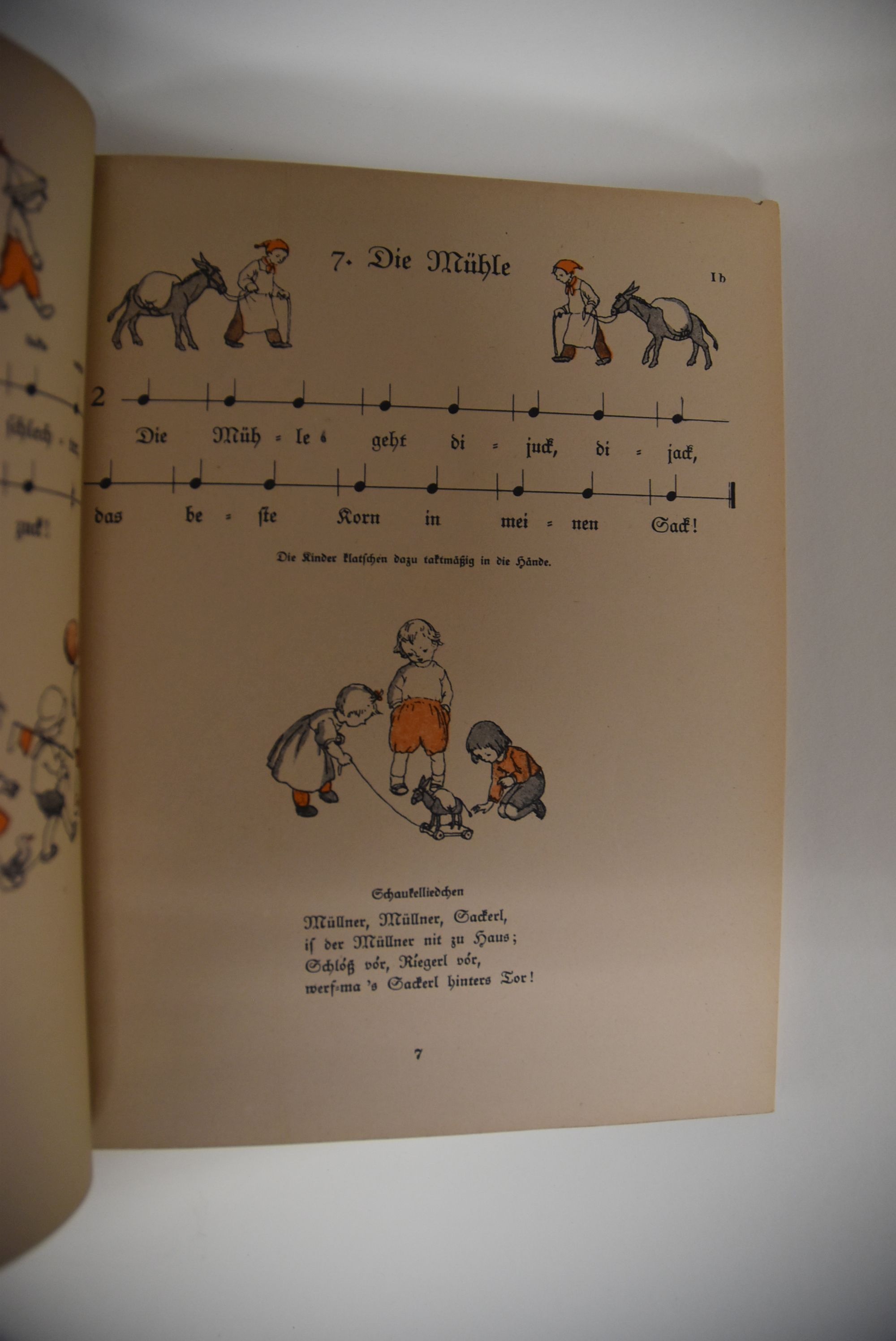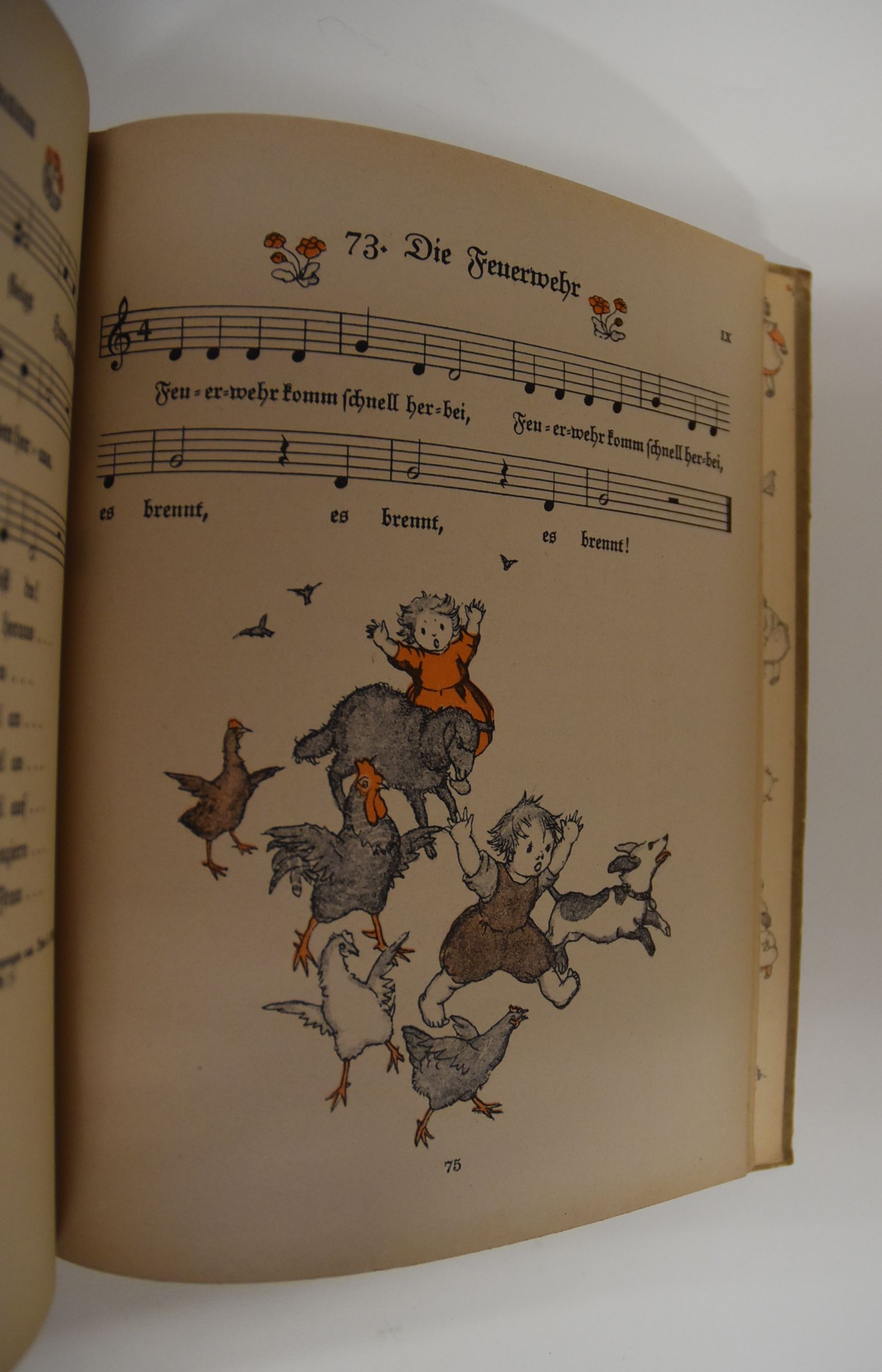 Zustand: Halbleineneinband, berieben und gebräunt, Ecken sind fachkundig nachgeklebt, Namenseintrag auf Vorderdeckel und Titelseite (B.W. Reims), Stempel einer Buchhandlung im Vorsatz, fliegender Vorsatz ist fachkundig wieder eingesetzt worden. Papier deutlich gebräunt, Frakturschrift. Die ersten Seiten an der Oberkante mit kleiner Fehlstelle. --- Inhalt: 98 Lieder mit Noten, Illustriert in orange/braun/grau-Tönen von Ida Bohatta. Umfangreiche, verschiedene Register z.B. auch nach Tonarten PAU3-5
