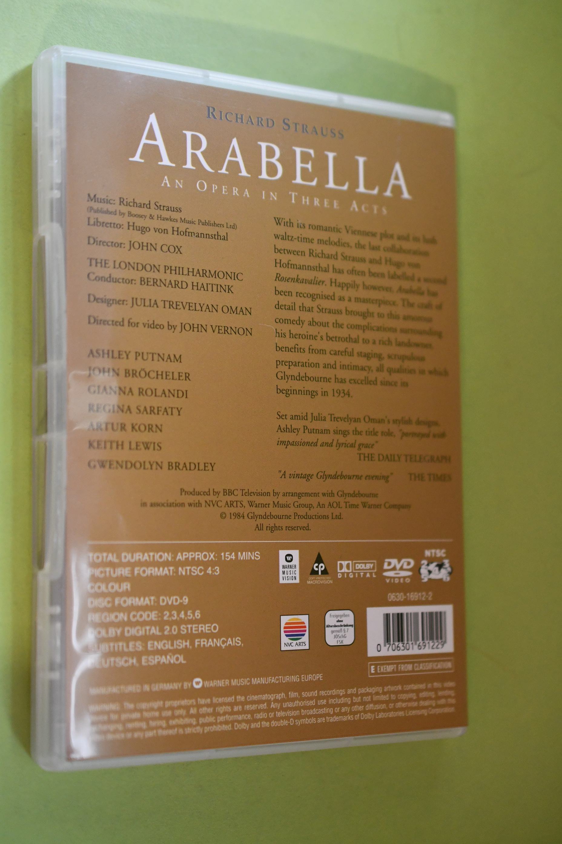 Zustand: DVD in Kunststoffhülle, sehr gut --- Inhalt: Aufnahme von 1984 von Glyndebourne Festival, Laufzeit 154 min. Direktor John Cox; Bernard Hattink mit The London Philharmonic. --- Inhalt: Text des Umschlags in englisch. Gesungen in deutsch mit Untertiteln in englisch, französisch, deutsch und spanisch--Die romantische Wiener Geschichte mit ihren opulenten Walzermelodien machte aus Arabella immer so etwas wie ein Märchen für Erwachsene. Viel Charme und Wärme zeichnen eine der bekanntesten Opern Strauss` aus. Die stilvoll und moderne Inszenierung aus dem Jahre 1984 glänzt unter der Leitung von Bernard Haitink mit der amerikanischen Sopranistin Ashley Putnam als die charmante Arabella sowie dem Bariton John Brochelor als Mandryka. T3-6