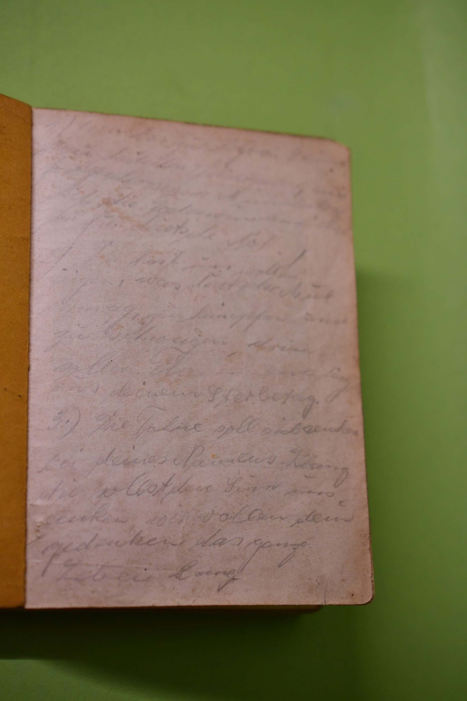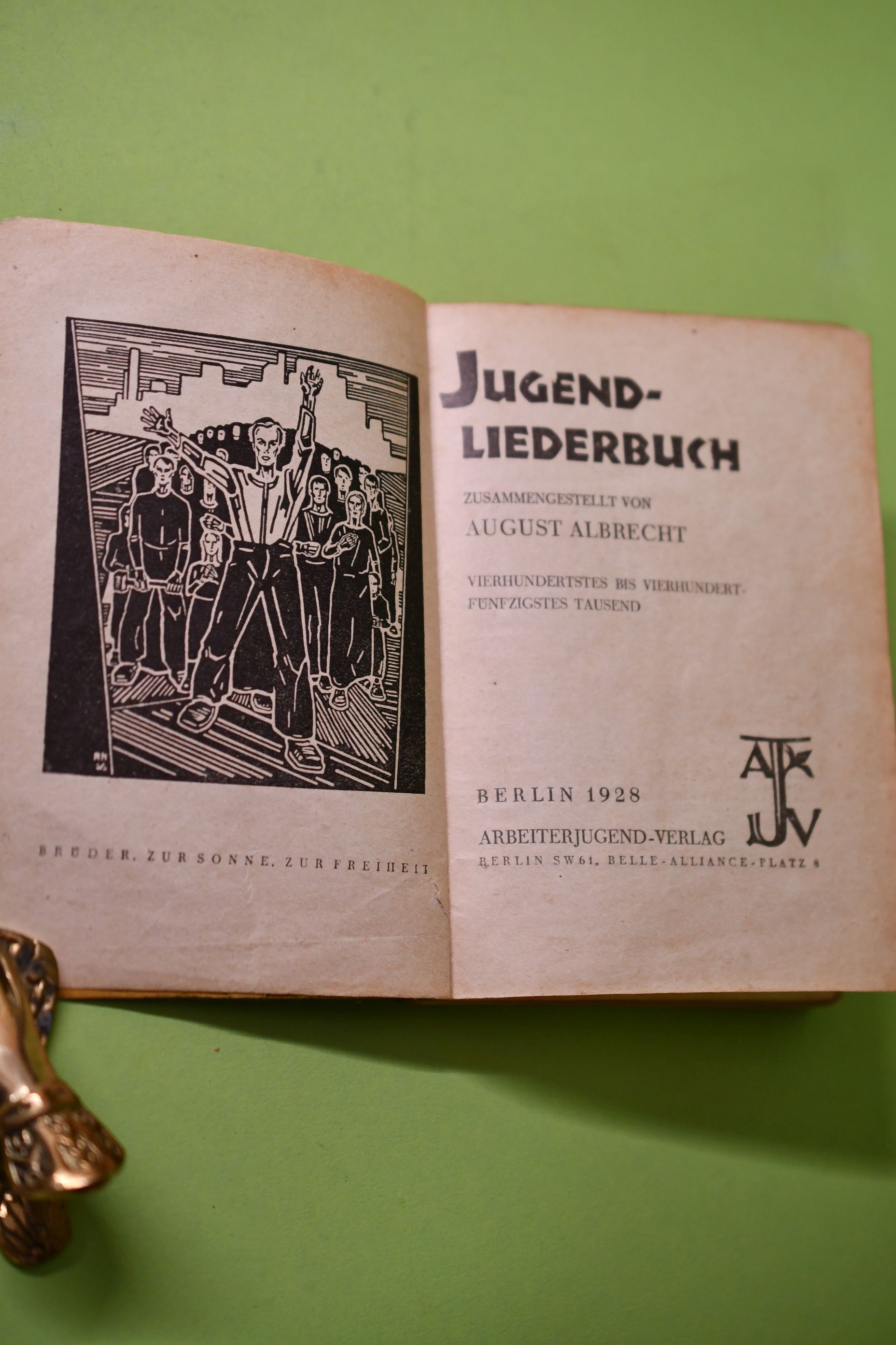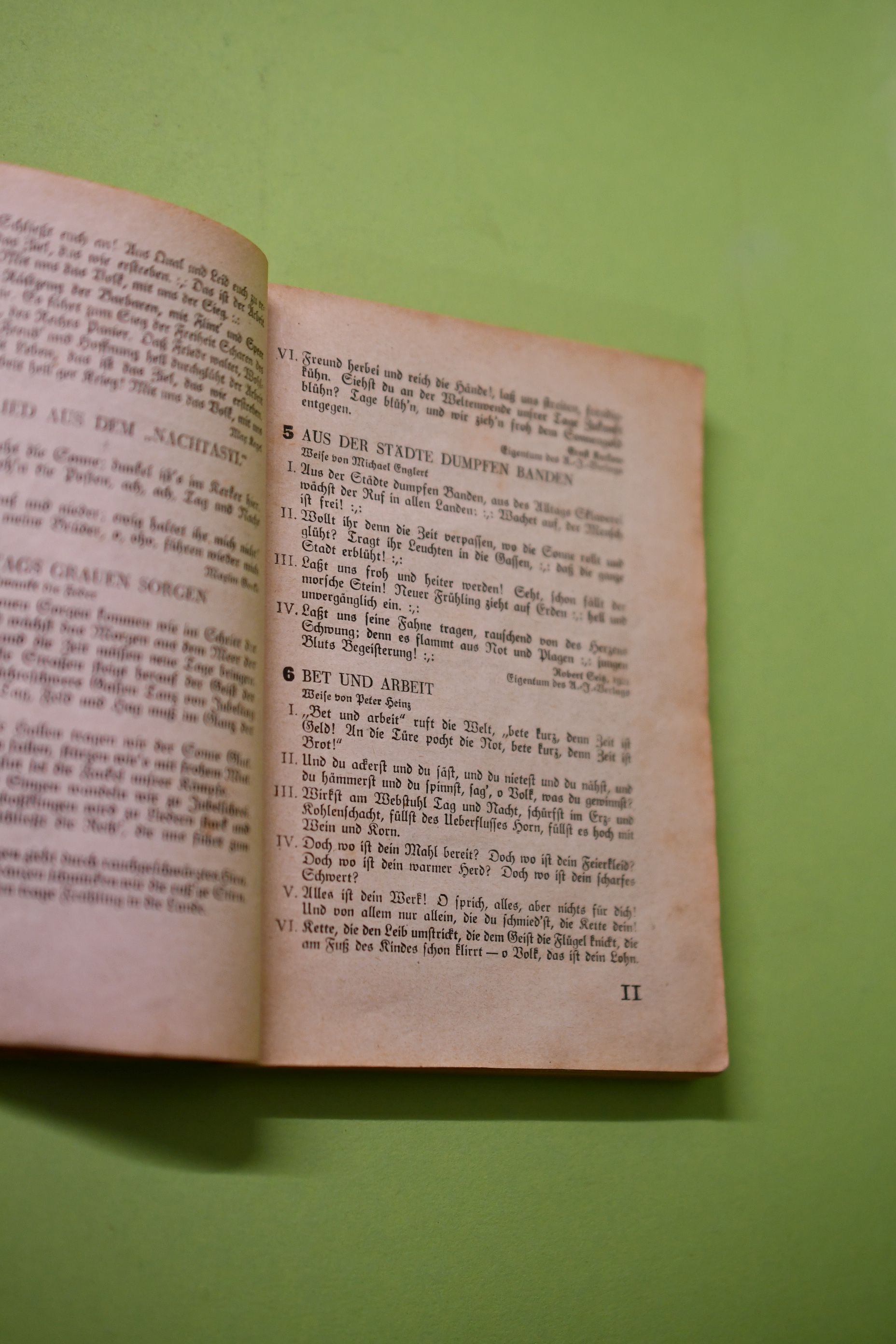 Zustand: starke Abnutzungsspuren, Abrissspur auf Vorderdeckel (auch mit Knickspur und eingerissen), angeschmutzt, erste leere Seite beschriftet, durchgängig schwach fleckig --- Inhalt: (politische) Liedtexte ohne Noten