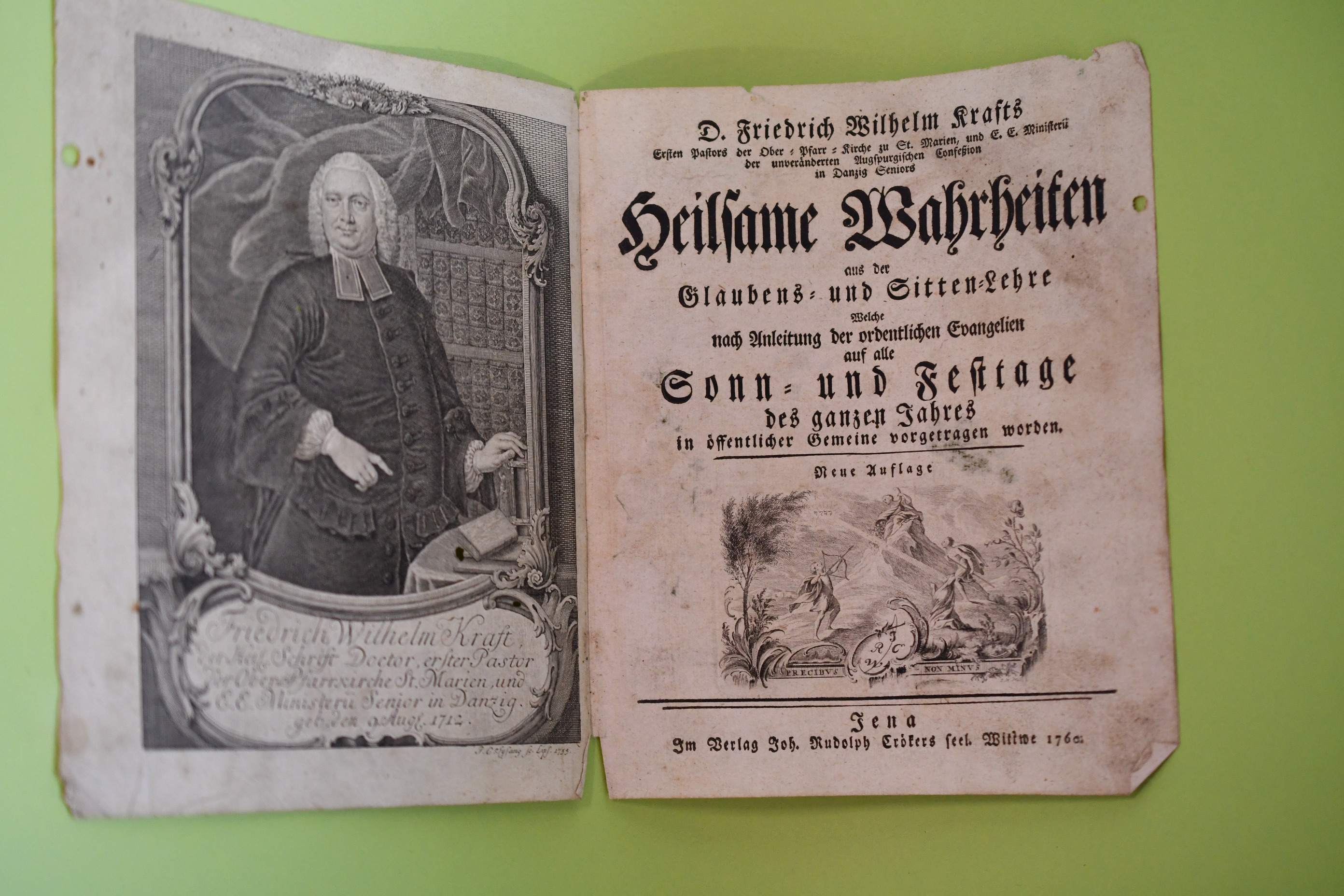 Doppelblatt, 35x21,3cm Doppelblatt Zustand: angeschmutztes, mit einigen alten Löchern bzw. einer dünnen Stelle und Abnutzungsspuren, fleckig. Frakturschrift --- Inhalt: Rückseite nicht bedruckt. Links Stich von J.G.Sysang sc.Lips. 1755, der den Pastor zeigt, rechts Titelseite von D. Friedrich Wilhelm Krafts Ersten Pastors der Ober-Pfarr-Kirche zu St. Marien, und E. E. Ministerii der unveränderten Augspurgischen Cofeßion in Danzig Seniors Helsame Wahrheiten aus der GLaubens- und Sitten-Lehre Welche nach Anleitung der ordentlichen Evanglien auf alle Sonn- und Feiertage des ganzen Jahres in öffentlicher Gemeine vorgetragen worden. Neue Auflage. Stich mit drei Gestalten, davon zwei bewaffnet mit Pfeil und Boden bzw. Speer, die zu einer vierten mit Füllhorn in einer Berglandschaft aufsehen. KS001 0 (weniger anzeigen)